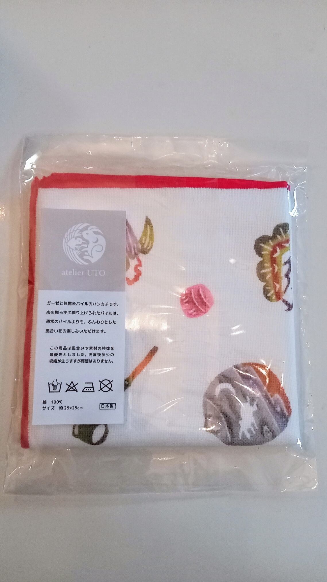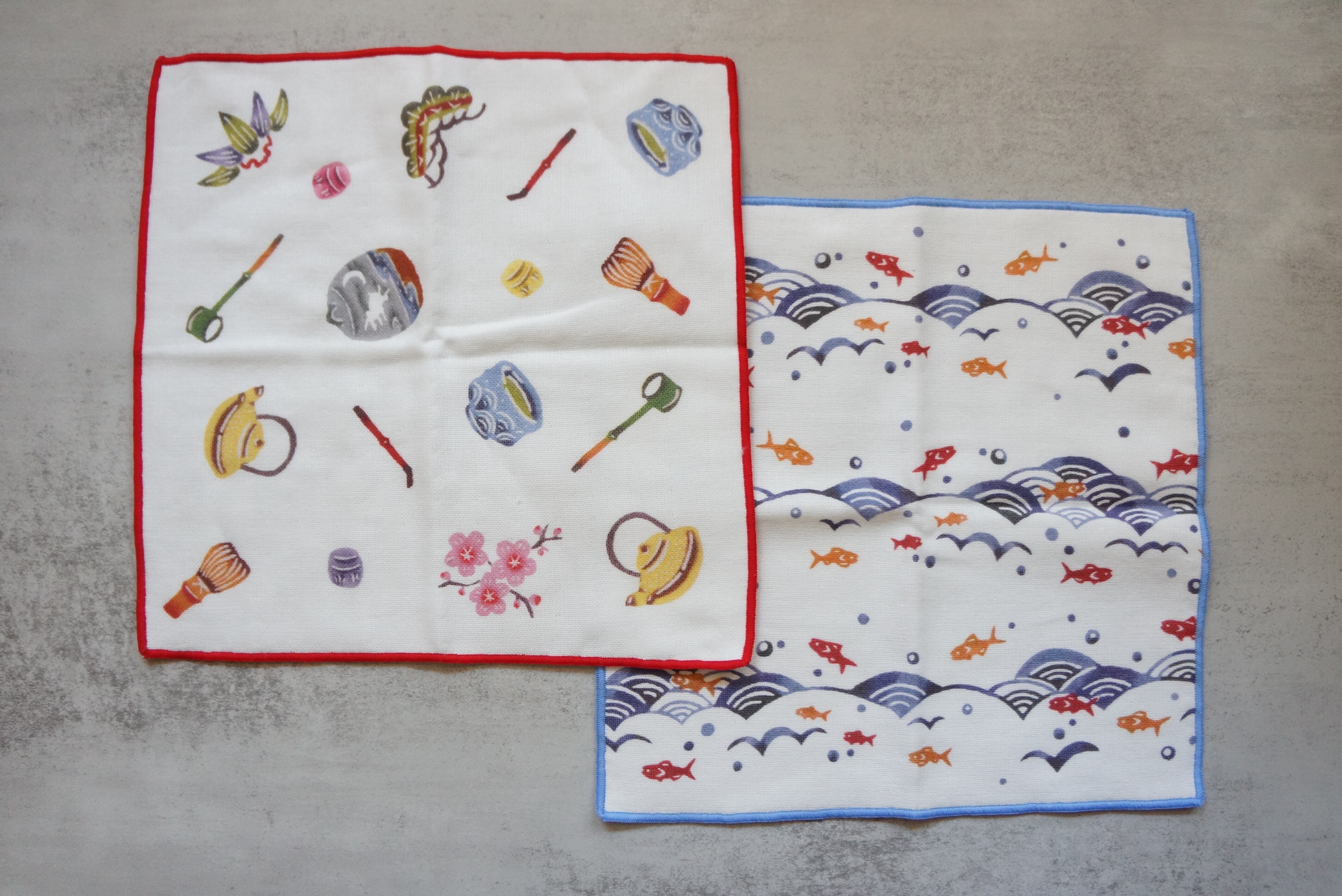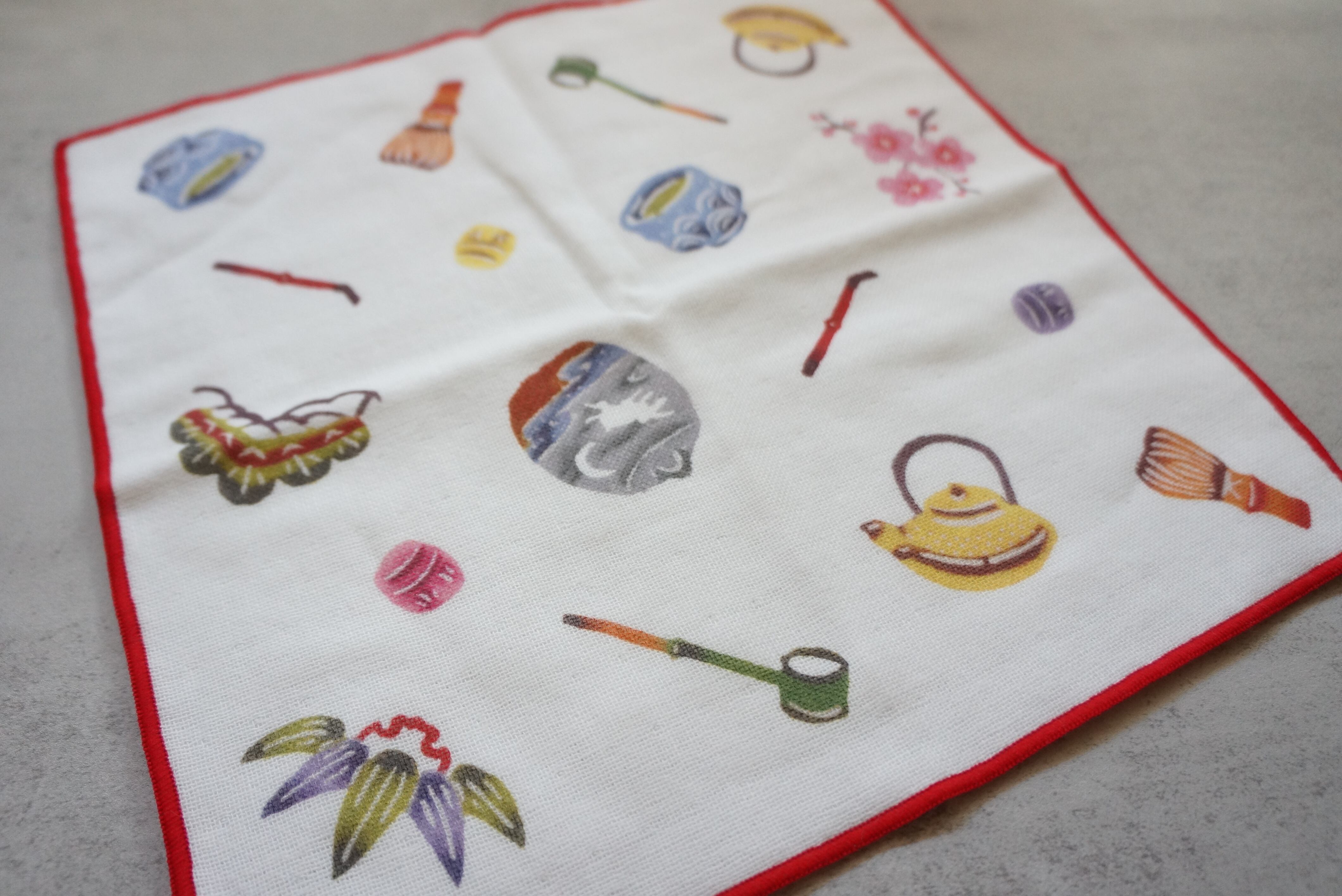 手染めの茶道具柄をプリントしたオリジナルハンカチです。