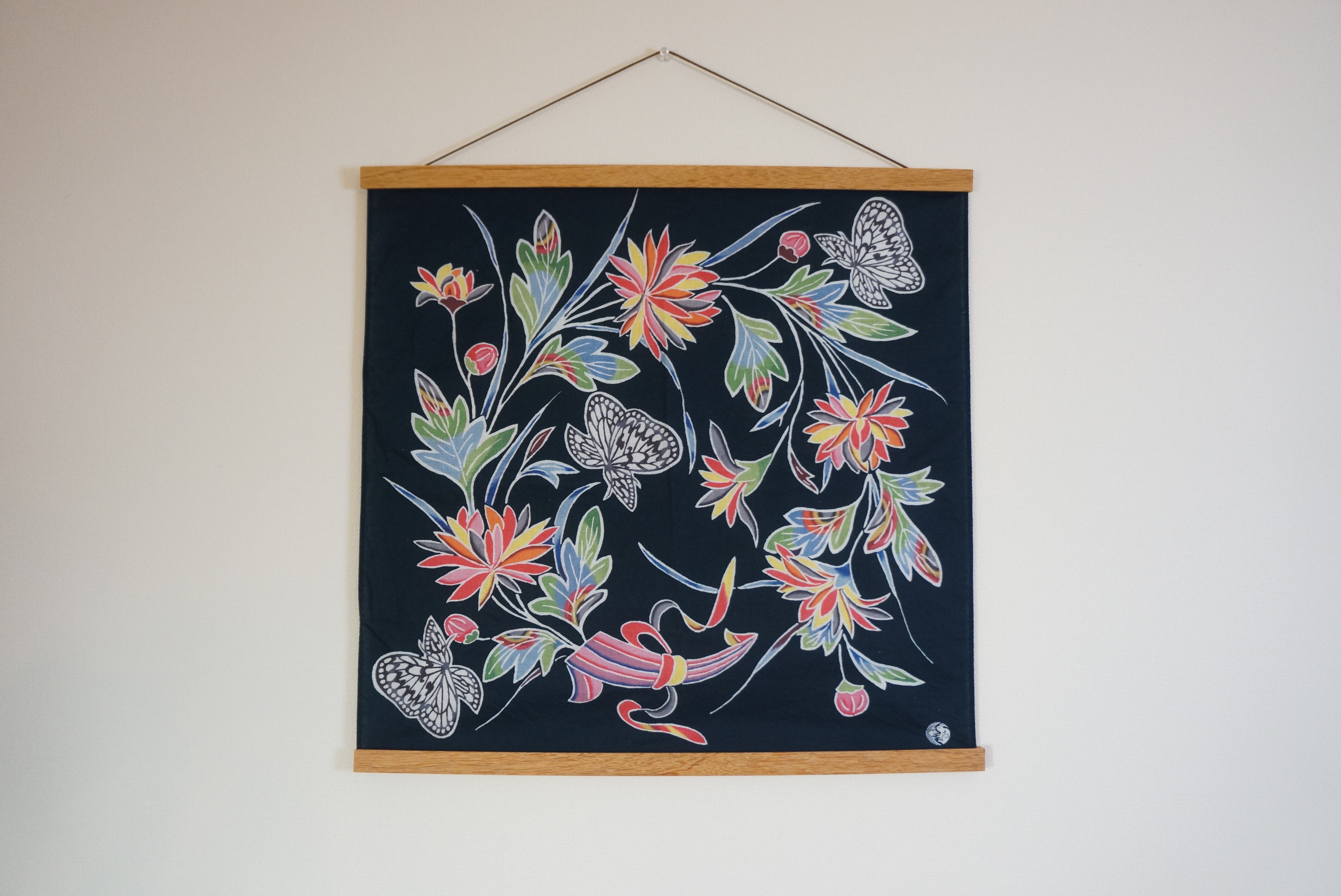 手染めの琉球紅型風呂敷をプリントしたオリジナルハンカチです。お弁当包みとして使ったり、タペストリーとして飾るのも良いです。